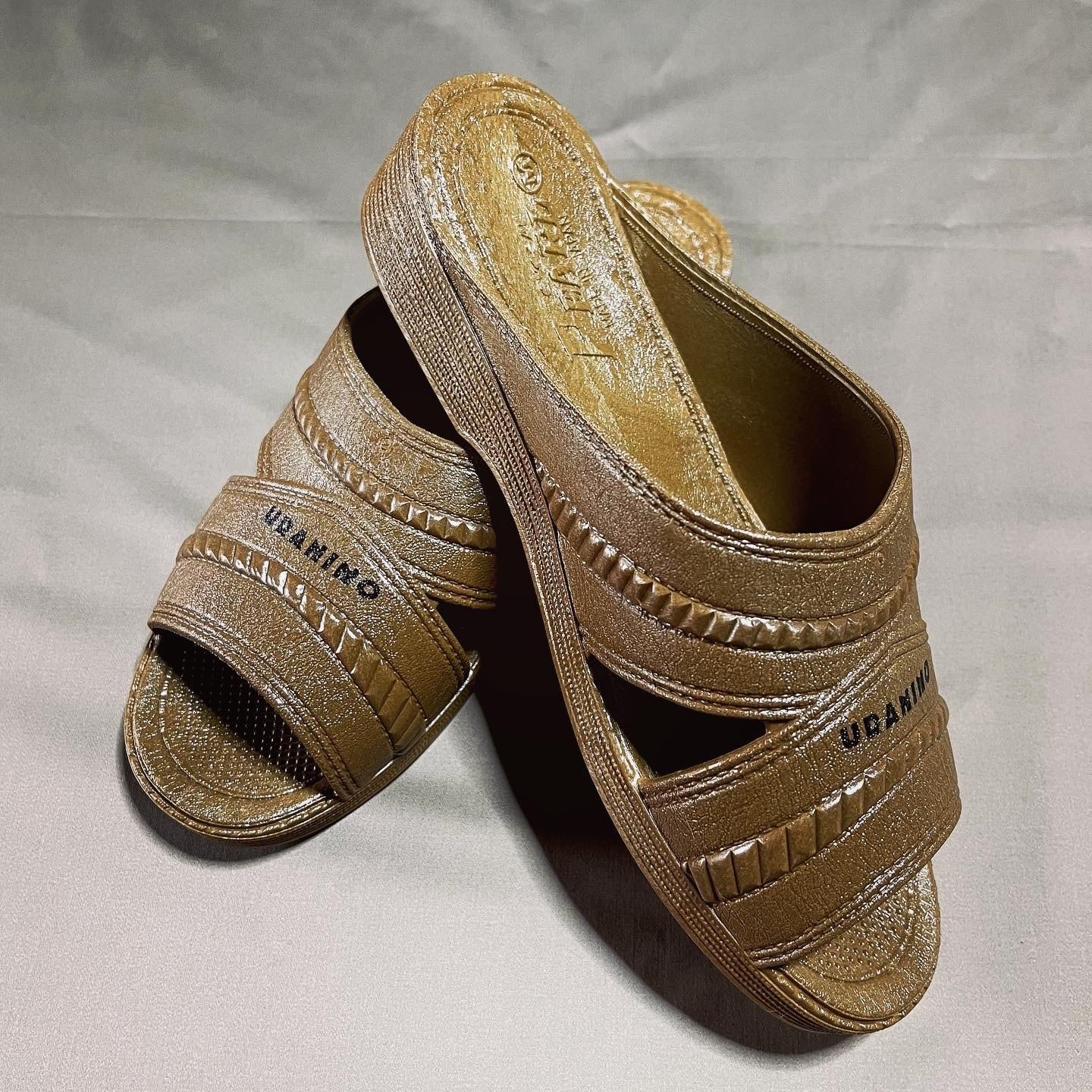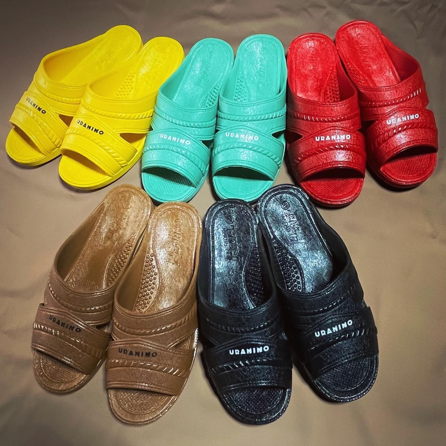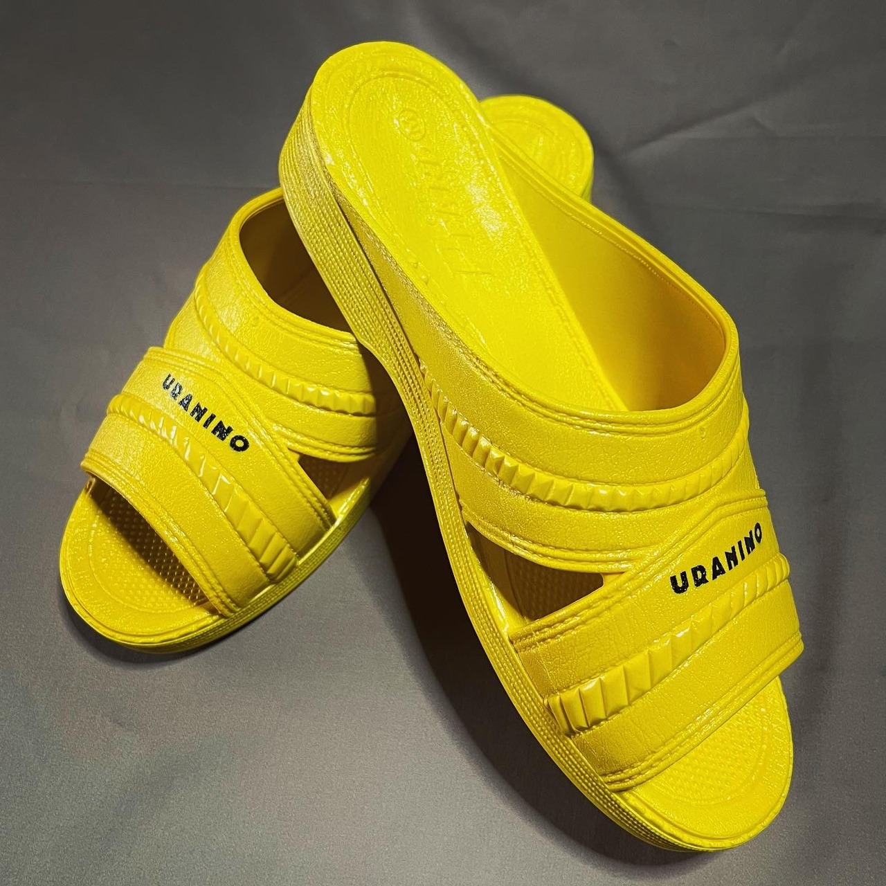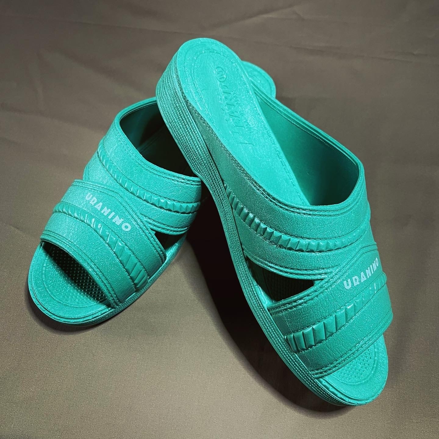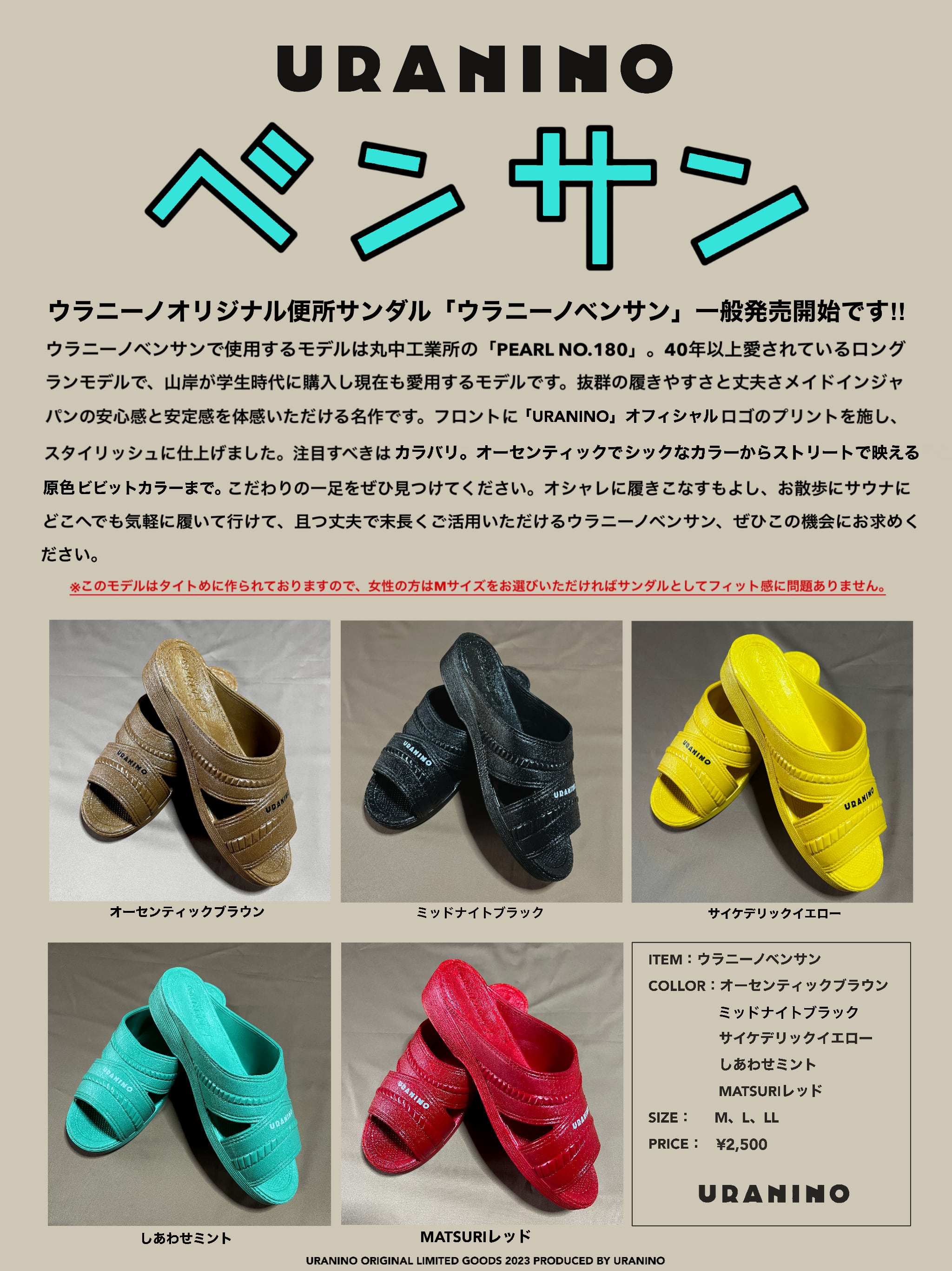 ウラニーノベンサンで使用しているモデルは丸中工業所の「PEARL NO.180」。40年以上愛されているロングセラーモデルで、ウラニーノボーカル山岸が学生時代に購入し現在も愛用するモデルです。抜群の履きやすさと丈夫さMADE IN JAPANの安定感を体感いただける名作です。フロントに「URANINO」のオフィシャルロゴのプリントを施し、スタイリッシュに仕上げました。注目すべきは空針。オーセンティックでシックなカラーからストリートで映える原色ビビットカラーまで、こだわりの一足をぜひ見つけてください。おしゃれに履きこなすのもよし、お散歩にサウナにどこへでも気軽に履いて行けて、且丈夫で末永くご活用いただけるウラニーノベンサン、ぜひこの機会にお求めください。このモデルはタイトめに作られておりますので、女性の方はMサイズををお選びいただければサンダルとしてフィット感に問題ありません。